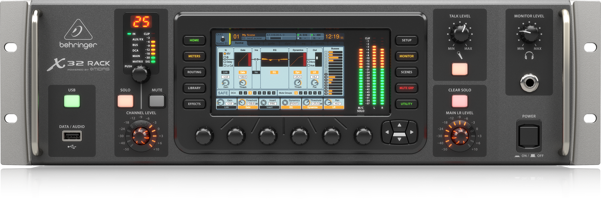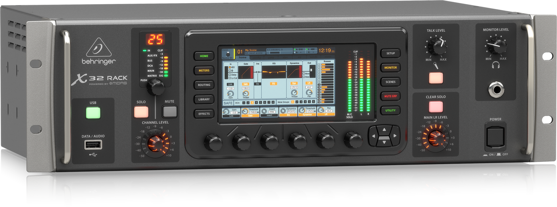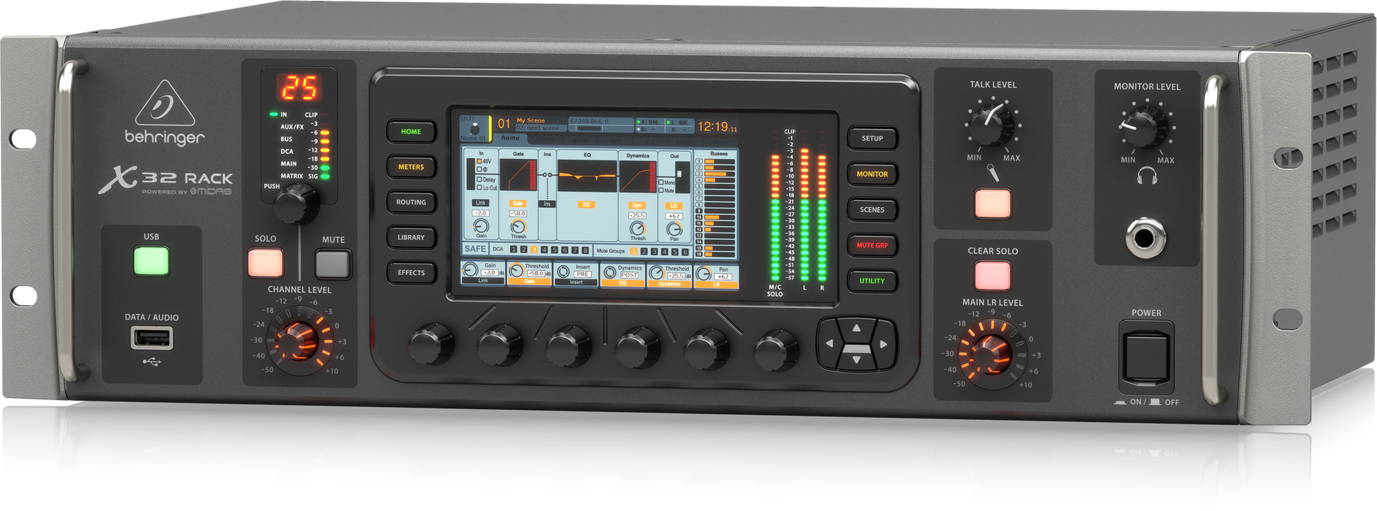 BASTIDOR X32 Mezclador digital en rack de 40 entradas y 25 buses con 16 preamplificadores Midas programables, interfaz de audio USB y control remoto para iPad/iPhone*
